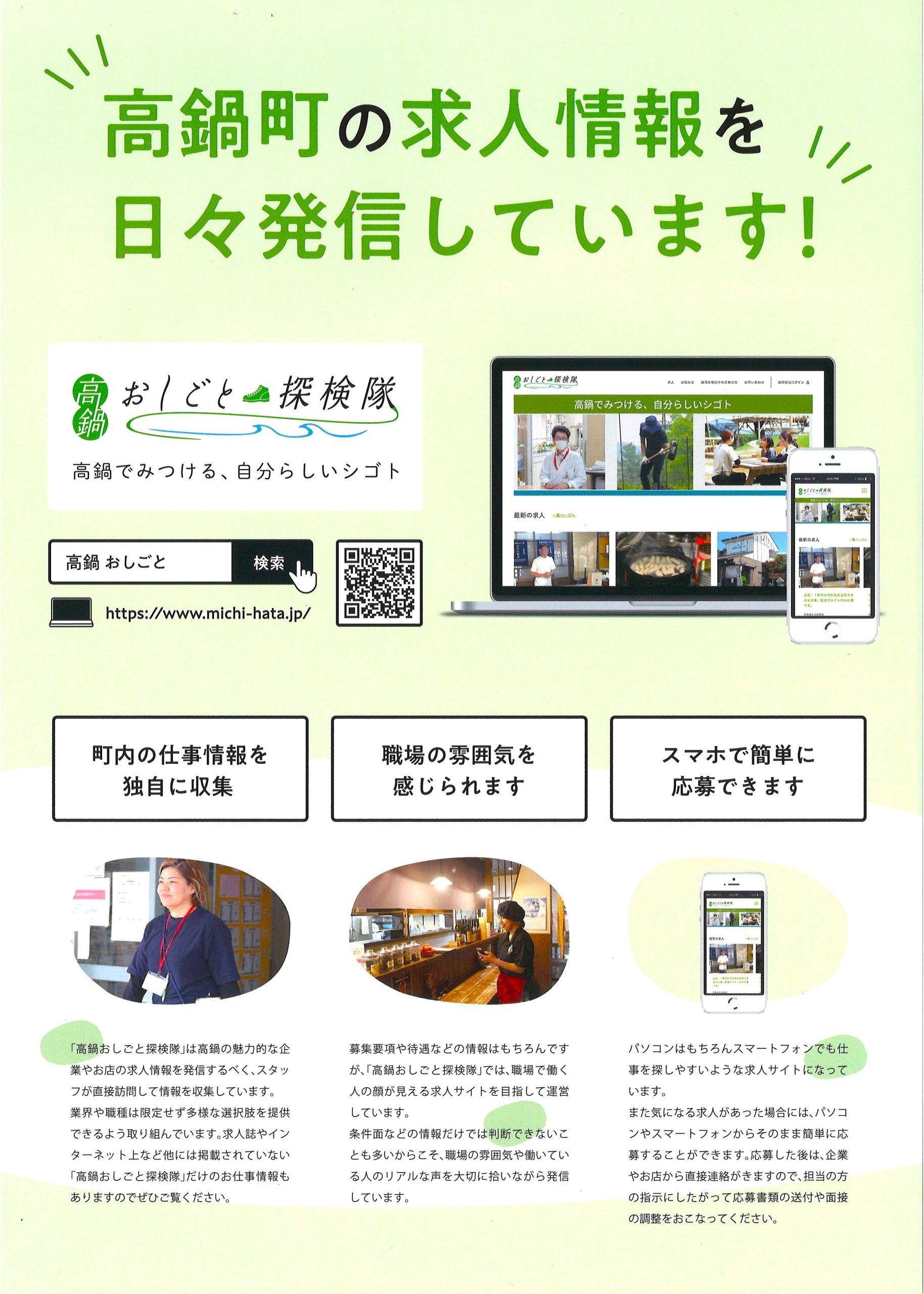 業界、職種を限定せず多様な選択肢を提供しており、求人誌やインターネット上には掲載されていないお仕事情報も「高鍋おしごと探検隊」には掲載されています。