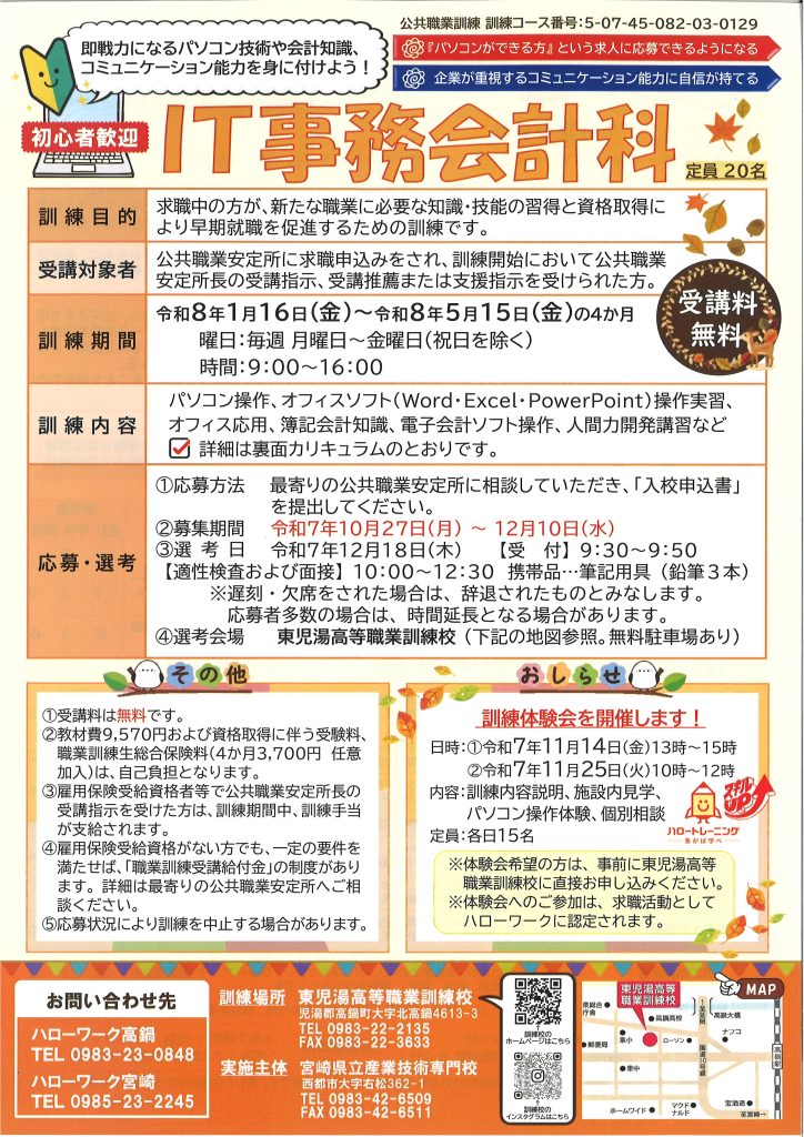 東児湯高等職業訓練校で『IT事務会計科』の受講ができます!